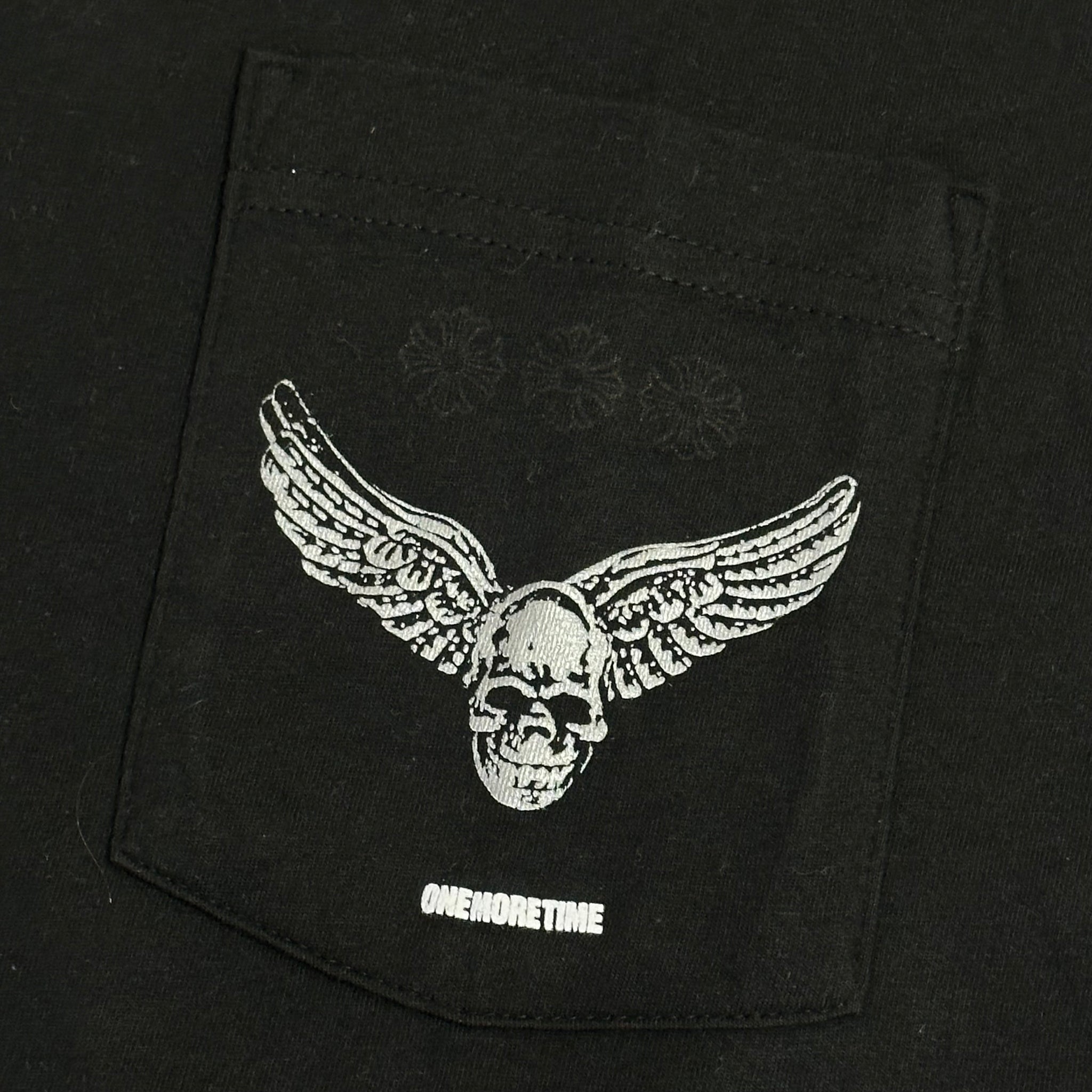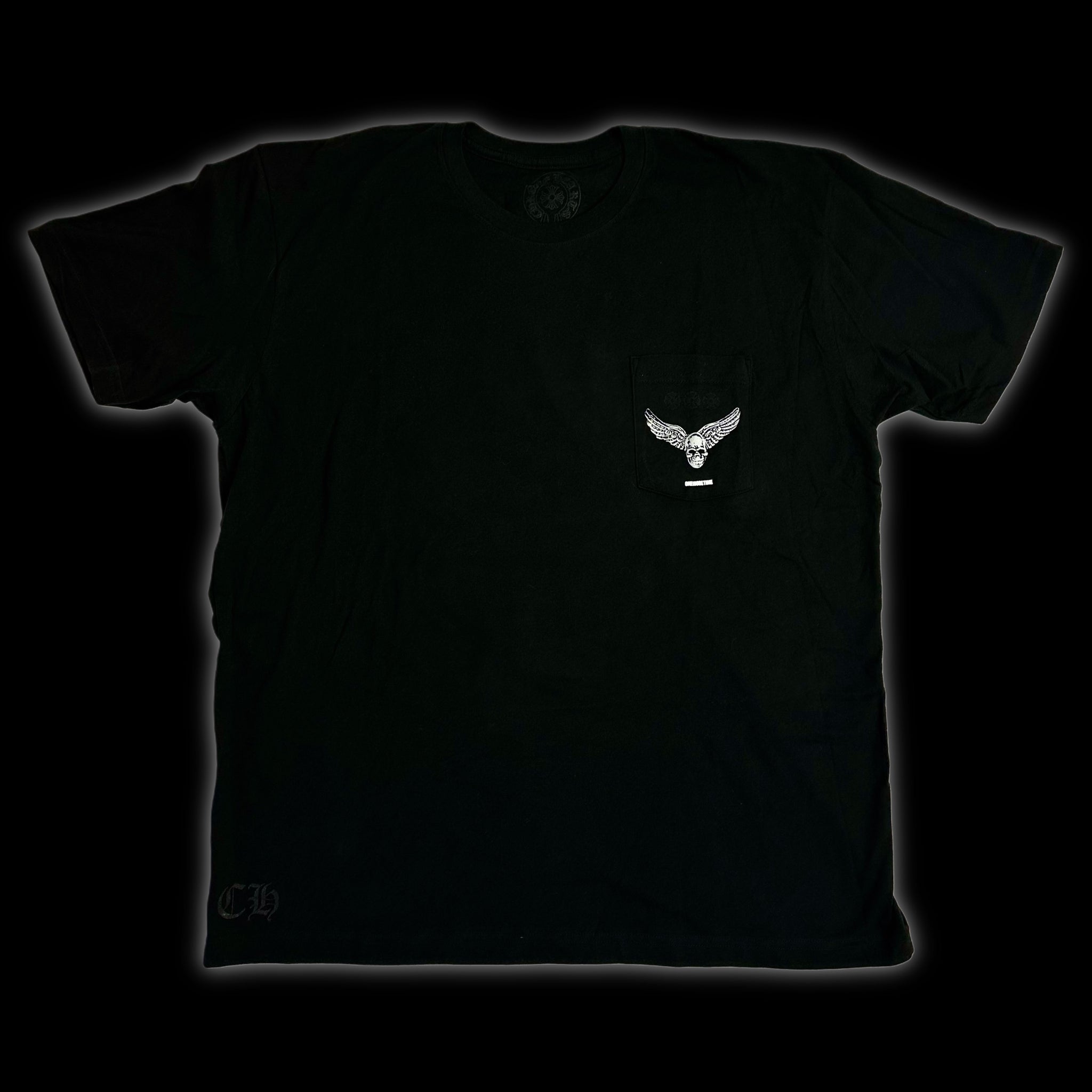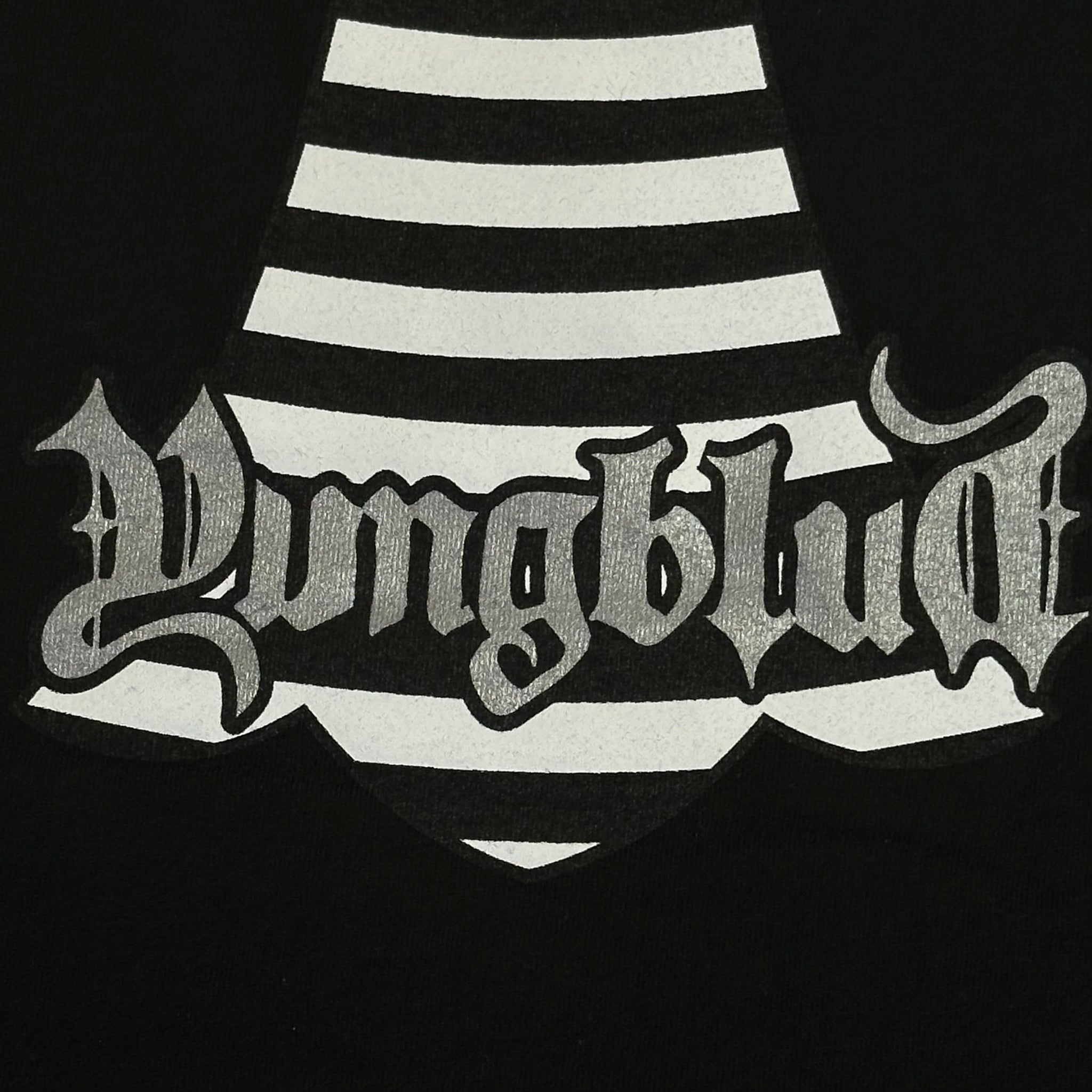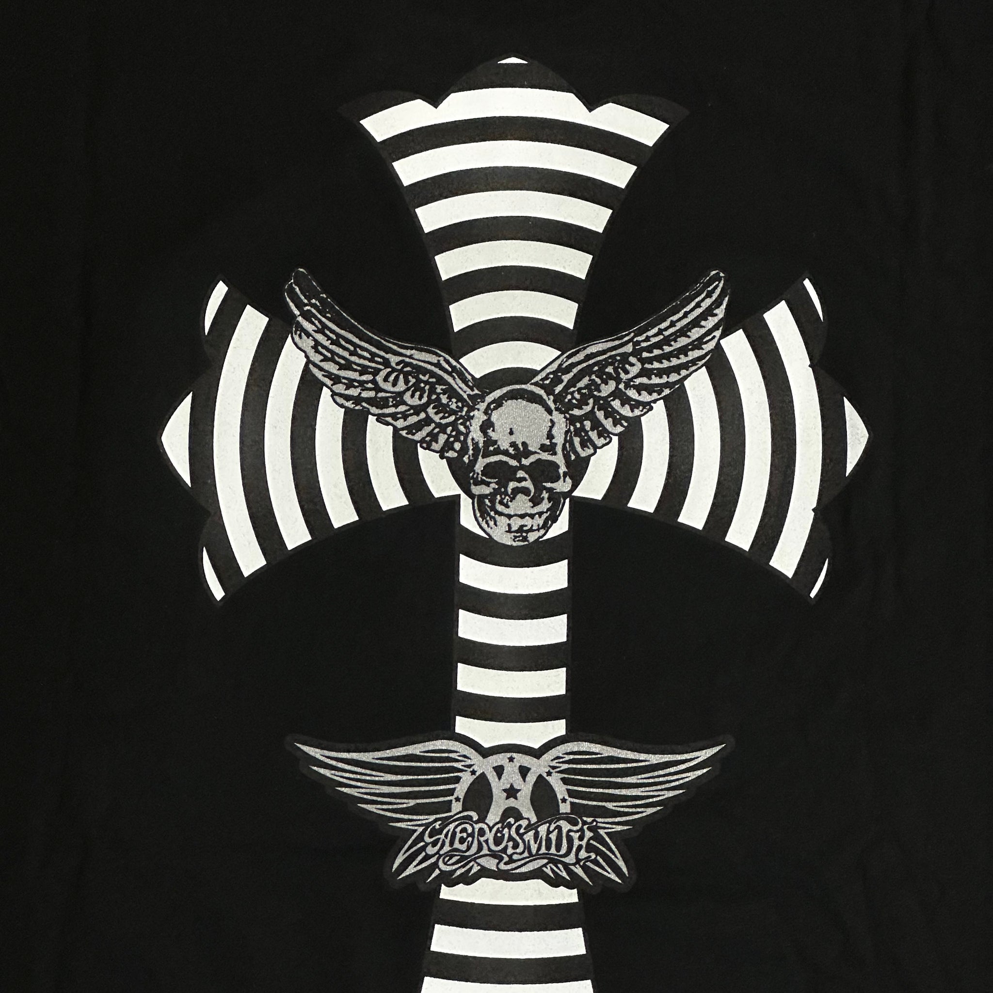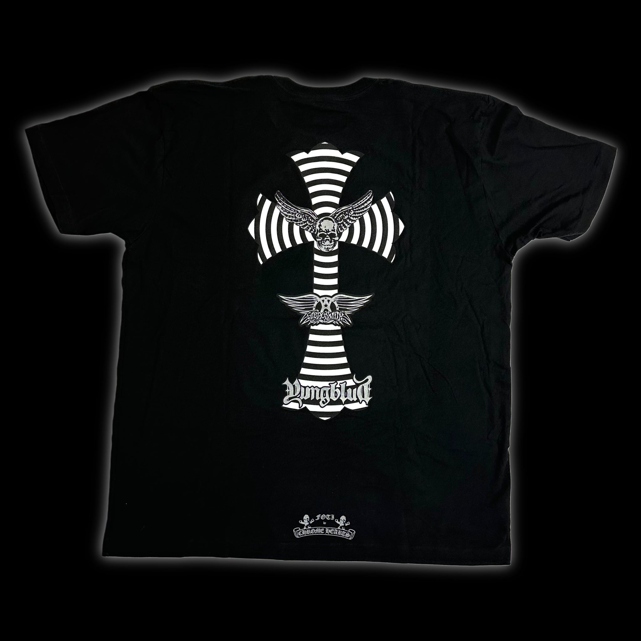 the tee is a cool remix to a chrome classic, a giant cemetery cross with record grooves & each respective party’s logos
