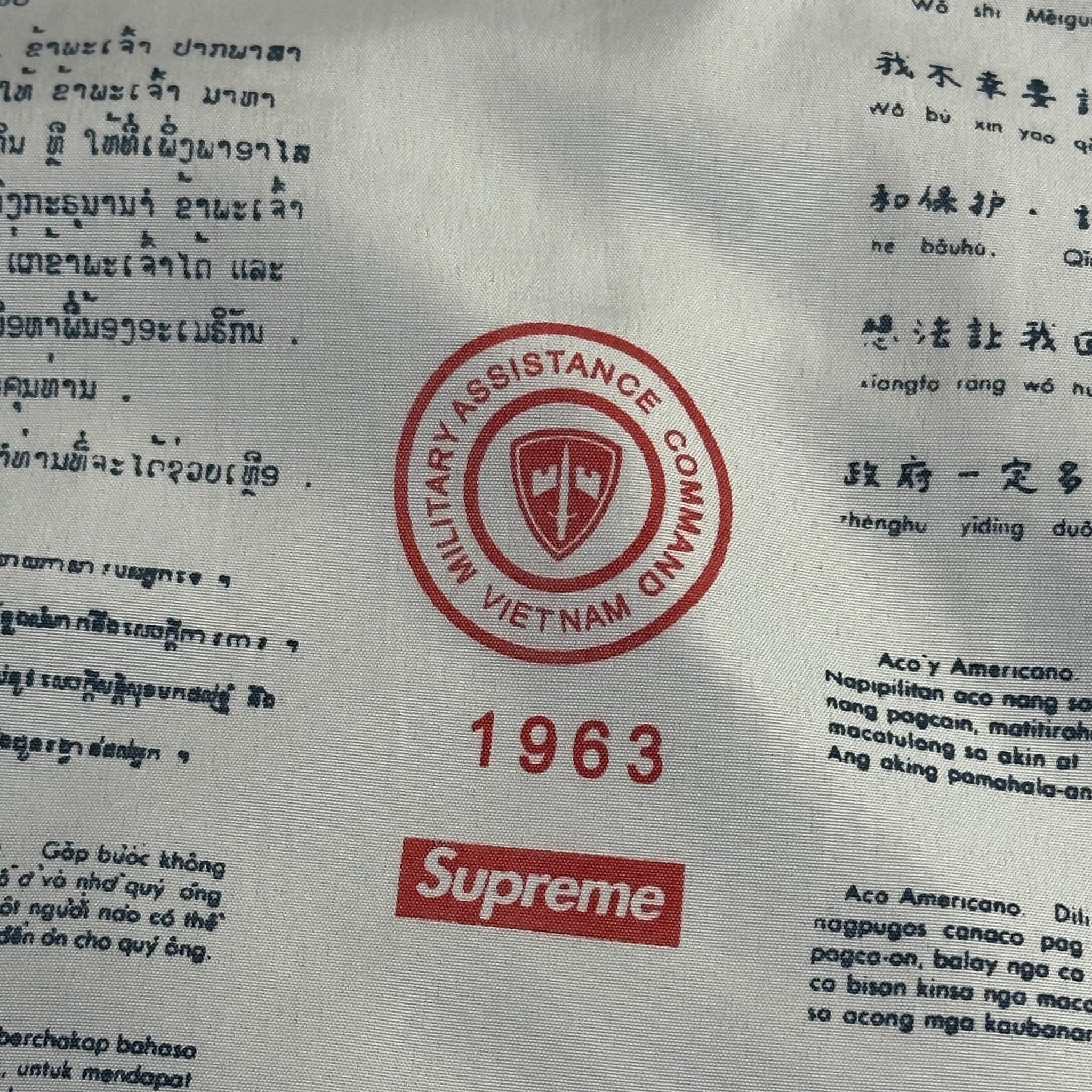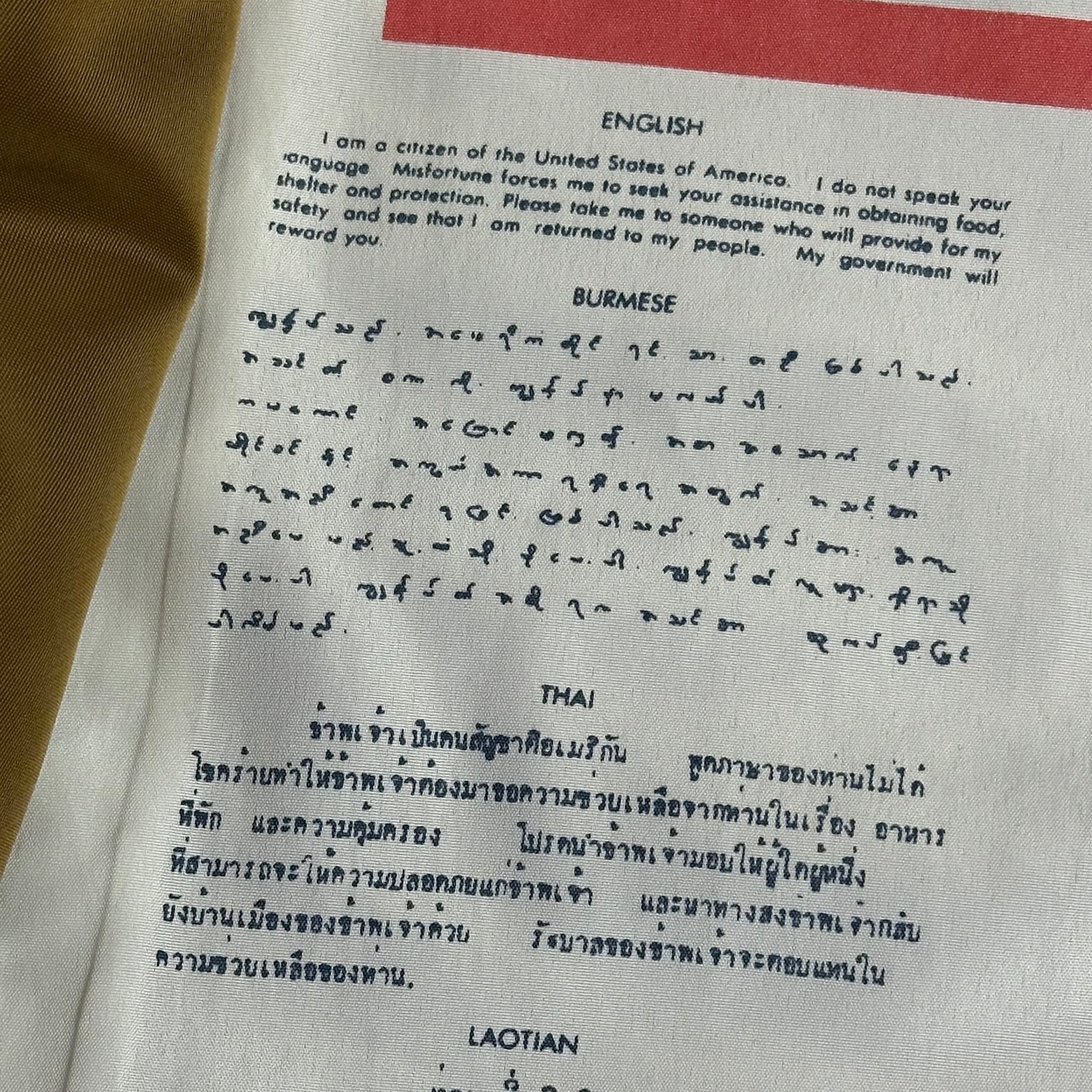 sewn inside is a “blood chit” — if the wearer were to be shot down, lost or in need of assistance in foreign territory, these instructions would help them to safety. inscribed are translations in more than a dozen languages