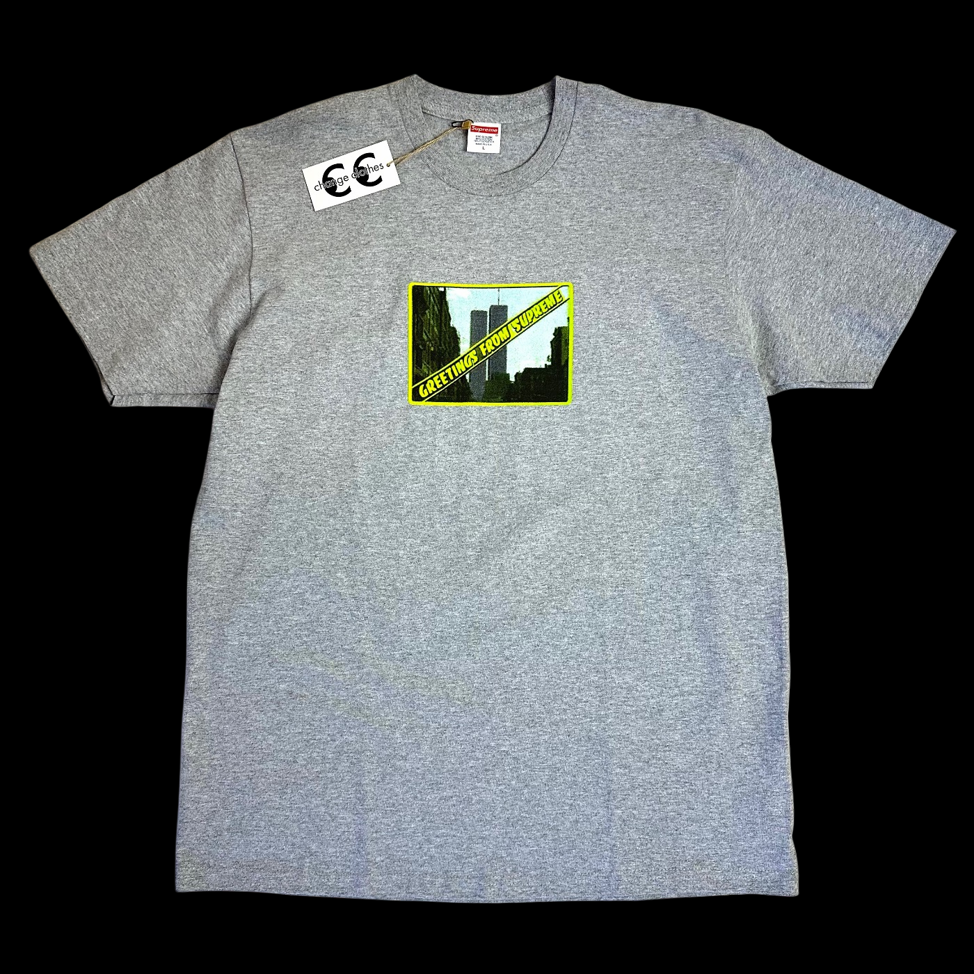 featuring a greeting card graphic of the twin towers with the phrase "greetings from supreme" written across it